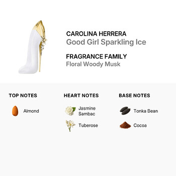 Crafted in the United States by the iconic design house Carolina Herrera, Good Girl Sparkling Ice is a dazzling twist on the classic Good Girl scent. It opens with a refreshing burst of icy citrus and delicate florals, followed by a heart of rich jasmine and warm tonka bean. The scent finishes with a smooth, seductive base of creamy woods, creating a balanced aroma that’s both vibrant and irresistible.