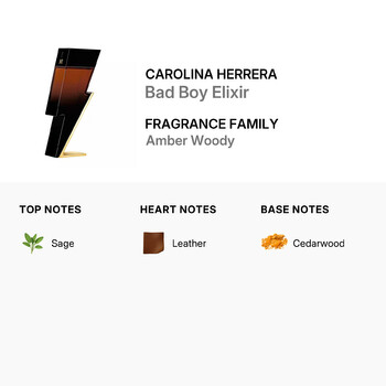 Crafted by the iconic American fashion house Carolina Herrera, Bad Boy Elixir opens with the energizing freshness of sage, creating an instantly captivating start. The heart reveals rich leather notes that add warmth and intensity, while the base of smooth cedarwood provides a bold and grounded finish. This dynamic blend is designed for the modern man who embraces confidence, strength, and a touch of mystery.