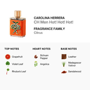 The top notes of CH Men Hot! Hot! Hot! feature a refreshing burst of grapefruit, violet leaf, and rhubarb leaf, setting the stage for a vibrant and energetic aroma. As the fragrance evolves, the heart notes of Sichuan pepper and angelica add a spicy and aromatic touch, creating depth and intrigue. Finally, the base notes of leather, Madagascar vetiver, and sandalwood provide a warm and sophisticated finish, ensuring the scent lingers throughout the day.