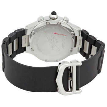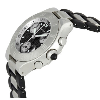 Stainless steel case with a black rubber strap with stainless steel links. Fixed stainless steel bezel engraved with Roman numerals. Black dial with luminous hands and index hour markers. Minute markers on outer rim. Magnified date display at the 4 o'clock position. Chronograph - three silver sub-dials displaying: 60 seconds, 30 minutes and 1/10th of a second. Quartz chronograph movement. Scratch resistant scratch resistant sapphire crystal. Black rubber crown set with cabochon. Stainless steel screw-down case back. Case diameter: 32 mm. Case thickness: 9.73 mm. Deployment clasp. Water resistant at 100 meters / 330 feet. Cartier 21 Chronoscaph Ladies Watch W10198U2.