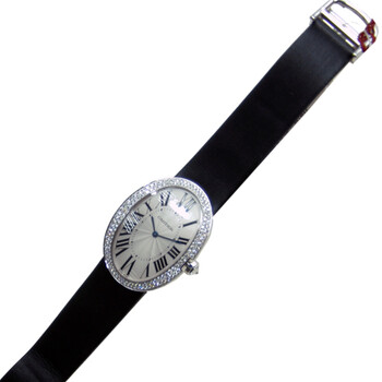 18 kt white gold case with a black satin bracelet. Fixed bezel set with diamonds. Silver flinque dial with blue hands and Roman numeral hour markers. Minute markers around an inner ring. Dial Type: Analog. Manual wind movement. Caliber 430 mc engine. Scratch resistant sapphire crystal. Octagonal crown set with a diamond. Skeleton case back. Case diameter: 44 x 34.07 mm. Case thickness: 10.05 mm. Oval case shape. Tang clasp. Water resistant at 30 meters / 100 feet. Functions: hour, minute. Luxury watch style. Watch label: Swiss Made. Cartier Baignoire Manual Wind Diamond Bezel 18 kt White Gold Ladies Watch WB520009.