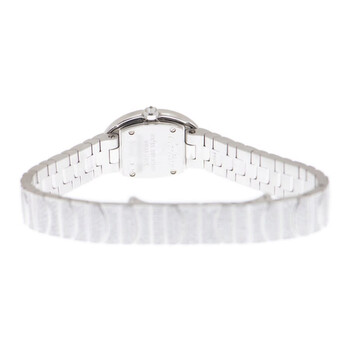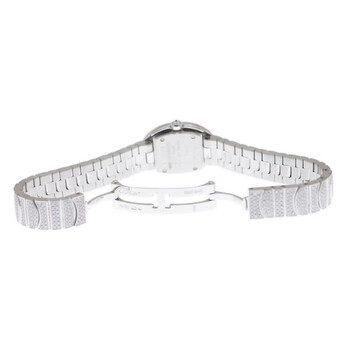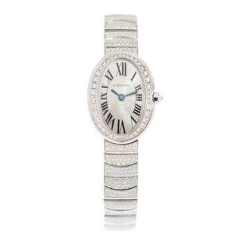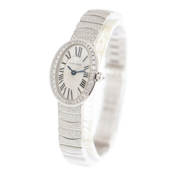 18kt rhodiumized white gold case with a 18kt rhodiumized white gold bracelet. Fixed bezel set with diamonds. Silver dial with blue-toned hands and Roman numeral hour markers. Dial Type: Analog. Quartz movement. Scratch resistant sapphire crystal. Case diameter: 25.30 mm x 20.79 mm. Case thickness: 7.73 mm. Oval case shape. Hidden folding clasp. Water resistant at 30 meters / 100 feet. Functions: hour, minute. Dress watch style. Watch label: Swiss Made. Cartier Baignoire Mini Silver Dial 18kt White Gold Diamond Ladies Watch HPI00327.