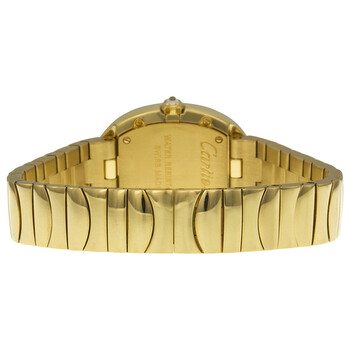 18kt yellow gold case with a 18kt yellow gold bracelet. Fixed 18kt yellow gold set with 40 diamond bezel. Silver dial with blued hands and Roman numeral hour markers. Dial Type: Analog. Quartz movement. Scratch resistant sapphire crystal. Pull / push crown. Solid case back. Case dimensions: 24.5 mm x 31.6 mm. Case thickness: 8.2 mm. Oval case shape. Hidden Folding clasp. Water resistant at 30 meters / 100 feet. Functions: hour, minute. Dress watch style. Watch label: Swiss Made. Cartier Baignoire Silver Dial 18kt Yellow Gold Ladies Watch WB520019.
