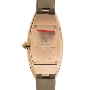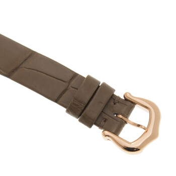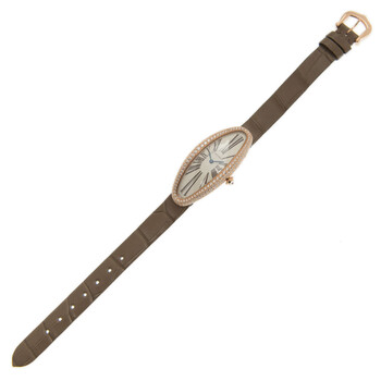 18kt rose gold case with a grey alligator band. Fixed 18kt rose gold bezel with diamond set. Silver-tone dial with blue hands and Roman numeral hour markers. Dial Type: Analog. Automatic movement. Scratch resistant sapphire crystal. Solid case back. Oval case shape, case size: 21 mm. Buckle clasp. Water resistant at 30 meters / 100 feet. Functions: hour, minute. Baignoire Series. Luxury watch style. Watch label: Swiss Made. Cartier BAIGNOIRE Silver-tone Dial Unisex Watch WJBA0006.