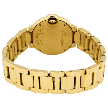 18kt yellow gold case with an 18kt yellow gold bracelet. Fixed 18kt yellow gold bezel set with diamonds. Silver opaline dial with blued hands and black Roman numeral hour markers. Minute markers around the inner ring. Battery operated Calibre 057 quartz movement. Scratch resistant sapphire crystal. Fluted crown set with a cabochon. Solid case back. Case diameter: 28.5 mm. Hidden folding clasp. Water resistant at 30 meters / 100 feet. Cartier Ballon Bleu Diamond Ladies Watch WE9001Z3.
