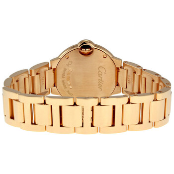 18kt rose gold case and bracelet. Fixed bezel set with diamonds. Silver opaline dial with blue steel hands and Roman numeral hour markers. Minute markers around the inner ring. Battery operated calibre 057 quartz movement. Scratch resistant sapphire crystal. 18kt rose gold crown with a cabochon. Solid case back. Case diameter: 29 mm. Deployment clasp. Water resistant at 30 meters / 100 feet. Functions: hours, minutes. Cartier Ballon Bleu 18kt Rose Gold Ladies Watch WE9002Z3.