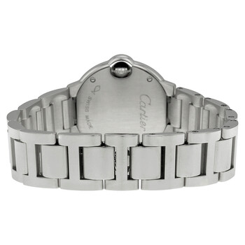 18kt white gold case and bracelet. Fixed 18kt white gold bezel set with diamonds. Silver opaline dial with blue hands and Roman numeral hour markers. Minute markers around an inner ring. Luminescent hands and dial markers. Battery operated calibre 057 quartz movement. Scratch resistant sapphire crystal. 18kt white gold fluted crown with sapphire cabochon. Solid case back. Case diameter: 28.5 mm. Case thickness: 9.35 mm. Deployment clasp. Water resistant at 30 meters / 100 feet. Functions: hour and minutes. Cartier Ballon Bleu 18kt White Gold Ladies Watch WE9003Z3.