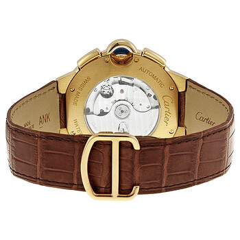 18kt yellow gold case with a brown leather strap. Fixed 18kt yellow gold bezel. Silver guilloche dial with blue steel hands and Roman numeral hour markers. Minute markers around the inner ring. Dial Type: Analog. Date display appears at the 9 o'clock position. Chronograph - two sub-dials displaying: 30 minutes, and 60 seconds. Automatic movement. Scratch resistant sapphire crystal. Blue sapphire cabochon crown. Screwed down case back. Case diameter: 46.8 mm. Case thickness: 15 mm. Round case shape. Band width: 24 mm. Band length: 9.5 inches. Deployment clasp. Water resistant at 30 meters/ 100 feet. Functions: hours, minutes, seconds, calendar, chronograph. Sport watch style. Watch label: Swiss Made. Cartier Ballon Bleu 18kt Yellow Gold Case Chronograph Men's Watch W6920007.