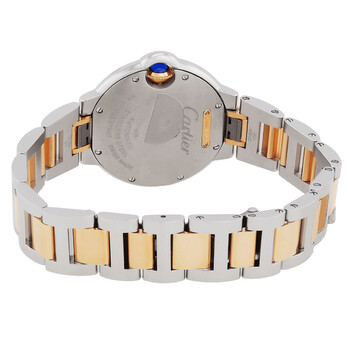 Silver-tone stainless steel case with a two-tone (silver-tone and yellow gold-tone) stainless steel and 18kt yellow gold bracelet. Fixed yellow gold-tone 18kt yellow gold bezel. Silver-tone dial with blued-steel sword-shaped hands and Roman numeral hour markers. Minute scale around the inner rim. Dial Type: Analog. Automatic movement. Scratch resistant sapphire crystal. Cabochon crown. Round case shape, case size: 33 mm, case thickness: 10.16 mm. Fold over clasp with a safety release. Water resistant at 30 meters / 100 feet. Functions: hour, minute, second. Ballon Bleu Series. Luxury watch style. Watch label: Swiss Made. Cartier Ballon Bleu Automatic Silver Dial Ladies Watch W2BB0037.
