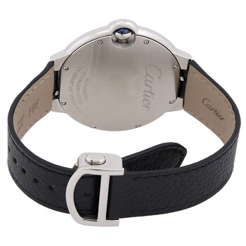 Stainless steel case with a black leather strap. Fixed stainless steel bezel. Silver dial with Roman numeral hour markers. Automatic movement with a 38-hour power reserve. Scratch resistant sapphire crystal. Screw down crown. Solid case back. Round case shape, case size: 40 mm. Deployment clasp. Water resistant at 30 meters / 100 feet. Functions: date, hour, minute, second. Ballon Bleu Series. Dress watch style. Watch label: Swiss Made. Cartier Ballon Bleu 40mm Automatic Silver Dial Watch WSBB0063.
