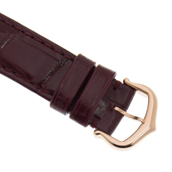 18kt rose gold case with a burgundy (alligator) leather strap. Fixed 18kt rose gold bezel set with diamonds. Silvered sunray-brushed dial with blued-steel sword-shaped hands and black Roman numeral hour markers. Minute markers around an inner ring. Dial Type: Analog. Automatic movement. Scratch resistant sapphire crystal. Sapphire cabochon crown. Solid case back. Round case shape. Case size: 33 mm. Case thickness: 10 mm. Tang clasp. Water resistant at 30 meters / 100 feet. Functions: hour, minute, second. Luxury watch style. Watch label: Swiss Made. Cartier Ballon Bleu Automatic 18kt Rose Gold Diamond Ladies Watch WJBB0033.