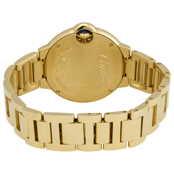 18kt yellow gold case with a 18kt yellow gold bracelet. Fixed 18kt yellow gold bezel set with diamonds. Silver sunray dial with blued-steel sword-shaped hands and Roman numeral hour markers. Minute markers around an inner ring. Dial Type: Analog. Automatic movement. Scratch resistant sapphire crystal. Pull / push crown. Solid case back. Round case shape. Case size: 33 mm. Case thickness: 10 mm. Hidden clasp. Water resistant at 30 meters / 100 feet. Functions: hour, minute, second. Luxury watch style. Watch label: Swiss Made. Cartier Ballon Bleu Automatic 18kt Yellow Gold Ladies Watch WJBB0042.