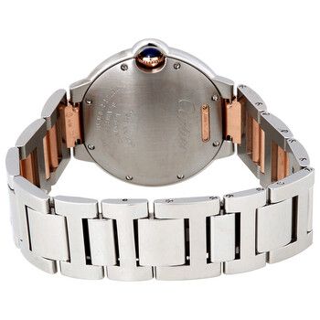 Stainless steel case with a stainless steel bracelet with 18kt rose gold links bracelet. Fixed 18kt rose gold bezel. Silver dial with blued-steel sword-shaped hands and diamond hour markers. An Arabic numeral appears at the 12 o'clock position. Minute markers around an inner ring. Dial Type: Analog. Cartier calibre 076 automatic movement, based upon ETA 2670, containing 25 Jewels, bitting at 28800 vph, and has a power reserve of approximately 38 hours. Scratch resistant sapphire crystal. Push / pull with a blue synthetic cabochon crown. Solid case back. Round case shape. Case size: 36 mm. Case thickness: 12.05 mm. Hidden fold over clasp. Water resistant at 30 meters / 100 feet. Functions: hour, minute. Additional Info: dial set with 11 brilliant-cut diamonds totaling 0.09 carats. Ballon Bleu Series. Luxury watch style. Watch label: Swiss Made. Cartier Ballon Bleu Automatic Diamond Dial Ladies Steel and 18kt Rose Gold Watch W3BB0013.