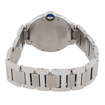 Silver-tone stainless steel case and bracelet. Fixed silver-tone stainless steel bezel set with 54 diamonds totaling 0.78 carats. Matte silvered sunray-brushed dial with blued-steel hands and diamond-Roman numeral hour markers. Roman numeral marker appears at the 12 o'clock position. Dial Type: Analog. Automatic movement. Scratch resistant sapphire crystal. Fluted crown set with a synthetic cabochon-shaped spinel. Solid case back. Round case shape, case size: 36 mm, case thickness: 12.06 mm. Water resistant at 30 meters / 100 feet. Functions: hour, minute. Ballon Bleu Series. Luxury watch style. Watch label: Swiss Made. Cartier Ballon Bleu Automatic Diamond Silver Dial Ladies Watch W4BB0036.