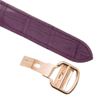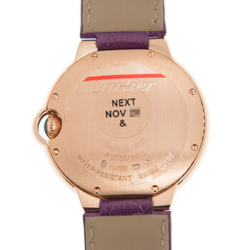 18kt rose gold case with a purple (alligator) leather strap. Fixed 18kt rose gold set with 123 diamonds bezel. White guilloche dial with blued-steel sword-shaped hands and black Roman numeral hour markers. Minute markers around an inner ring. Dial Type: Analog. Cartier calibre 076 automatic movement, based upon ETA 2670, containing 25 Jewels, bitting at 28800 vph, and has a power reserve of approximately 38 hours. Scratch resistant sapphire crystal. Push / pull crown set with a blue sapphire cabochon. Solid case back. Round case shape. Case size: 36 mm. Case thickness: 12.1 mm. Band width: 19 mm. Deployment clasp. Water resistant at 30 meters / 100 feet. Functions: hour, minute, second. Additional Info: 123 brilliant-cut diamonds 1.21 ct. Ballon Bleu Series. Sport watch style. Watch label: Swiss Made. Cartier Ballon Bleu Automatic Diamond White Dial Ladies Watch WJBB0009.