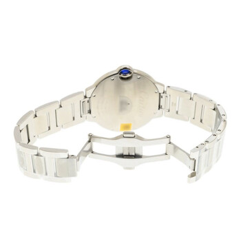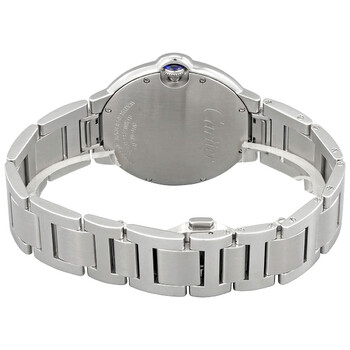 Stainless steel case with a stainless steel bracelet. Fixed stainless steel bezel. Grey dial with silver-tone hands and Roman numeral hour markers. Minute markers around an inner ring. Dial Type: Analog. Date display at the 3 o'clock position. Cartier calibre 1847 MC automatic movement, containing 23 Jewels, bitting at 28800 vph, and has a power reserve of approximately 42 hours. Scratch resistant sapphire crystal. Cabochon set crown. Solid case back. Round case shape. Case size: 40 mm. Case thickness: 12.4 mm. Deployment clasp with a push button release. Water resistant at 30 meters / 100 feet. Functions: date, hour, minute, second. Additional Info: original box, manual (complete accessories). Ballon Bleu Series. Luxury watch style. Watch label: Swiss Made. Cartier Ballon Bleu Automatic Grey Dial Men's Watch WSBB0060.