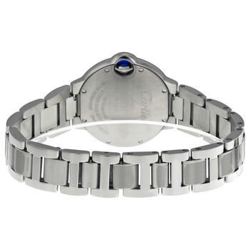 Stainless steel case with a stainless steel bracelet. Fixed stainless steel bezel. Silver flinque dial with blued-steel sword-shaped hands and Roman numeral hour markers. Minute markers around an inner ring. Dial Type: Analog. Cartier calibre 076 automatic movement, based upon ETA 2670, containing 25 Jewels, bitting at 28800 vph, and has a power reserve of approximately 38 hours. Scratch resistant sapphire crystal. Push / pull crown set with synthetic spinel cabochon. Solid case back. Round case shape. Case size: 33 mm. Case thickness: 9.96 mm. Deployment clasp with a push button release. Water resistant at 30 meters / 100 feet. Functions: hour, minute, second. Ballon bleu de cartier series. Luxury watch style. Watch label: Swiss Made. Cartier Ballon Bleu Automatic Silver Dial 33 mm Ladies Watch W6920071.
