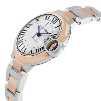 Stainless steel & 18k rose gold case with a polished stainless steel & 18k rose gold bracelet. Fixed 18k rose gold bezel. Silver dial with blued-steel sword-shaped hands and Roman numeral hour markers. Minute scale around the inner rim. Dial Type: Analog. Cartier Calibre 076 Automatic movement, based upon ETA 2670, containing 25 Jewels, bitting at 28800 vph, and has a power reserve of approximately 38 hours. Scratch resistant sapphire crystal. Pull / push crown. Solid case back. Round case shape, case size: 33 mm, case thickness: 10 mm. Hidden folding clasp. Water resistant at 30 meters / 100 feet. Functions: hour, minute, second. Ballon Bleu Series. Luxury watch style. Watch label: Swiss Made. Cartier Ballon Bleu Automatic Silver Dial Ladies Watch w2bb0032.
