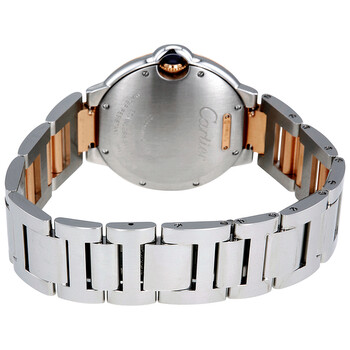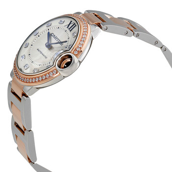 Stainless steel case with a stainless steel bracelet with 18kt rose gold links. Fixed 18kt rose gold bezel set with diamonds. Silver dial with blued-steel sword-shaped hands and diamond hour markers. A Roman numeral appears at the 12 o'clock position. Minute markers around an inner ring. Dial Type: Analog. Cartier calibre 076 automatic movement, based upon ETA 2670, containing 25 Jewels, bitting at 28800 vph, and has a power reserve of approximately 38 hours. Scratch resistant sapphire crystal. Solid case back. Round case shape. Case size: 36 mm. Case thickness: 12.05 mm. Deployment clasp. Water resistant at 30 meters / 100 feet. Functions: hour, minute. Additional Info: bezel set with 58 brilliant-cut diamonds (0.73 carats), crown set with a synthetic cabochon-shaped spinel. Ballon Bleu Series. Luxury watch style. Watch label: Swiss Made. Cartier Ballon Bleu Automatic Silver Dial Ladies Watch W3BB0004.