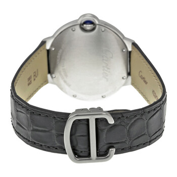 Stainless steel case with a black (alligator) leather strap. Fixed stainless steel bezel. Silver opaline dial with blued-steel sword-shaped hands and Roman numeral hour markers. Minute markers around an inner ring. Dial Type: Analog. Cartier calibre 076 automatic movement, based upon ETA 2670, containing 25 Jewels, bitting at 28800 vph, and has a power reserve of approximately 38 hours. Scratch resistant sapphire crystal. Fluted push / pull crown set with a spinel cabochon. Solid case back. Round case shape. Case size: 36.6 mm. Case thickness: 12.05 mm. Band width: 20 mm. Deployment fold over clasp. Water resistant at 30 meters / 100 feet. Functions: hour, minute, second. Ballon Bleu De Cartier Series. Luxury watch style. Watch label: Swiss Made. Cartier Ballon Bleu Automatic Silver Dial Ladies Watch W69017Z4.