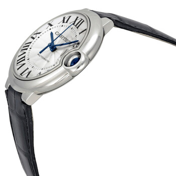 Stainless steel case with a black (alligator) leather strap. Fixed stainless steel bezel. Silvered opaline dial with blued-steel sword-shaped hands and Roman numeral hour markers. Minute markers around an inner ring. Dial Type: Analog. Date display at the 3 o'clock position. Cartier calibre 049 automatic movement, based upon ETA 2892-A2, containing 21 Jewels, bitting at 28800 vph, and has a power reserve of approximately 42 hours. Scratch resistant sapphire crystal. Fluted crown set with a blue spinel cabochon. Solid case back. Round case shape. Case size: 42.1 mm. Case thickness: 13 mm. Band width: 18.8 mm. Band length: 7 inches. Deployment clasp. Water resistant at 30 meters / 100 feet. Functions: date, hour, minute, second. Ballon Bleu De Cartier Series. Luxury watch style. Watch label: Swiss Made. Cartier Ballon Bleu Automatic Silver Dial Men's Watch W69016Z4.