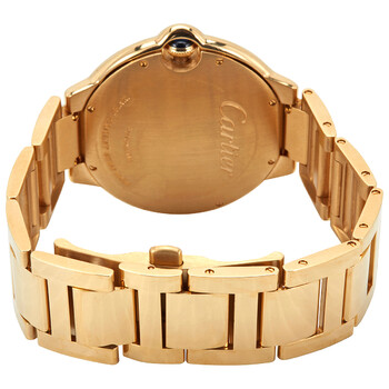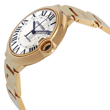 18kt yellow gold case with a polished 18kt yellow gold bracelet. Fixed 18kt yellow gold bezel. Silver dial with blued-steel sword-shaped hands and black Roman numeral hour markers. Minute scale around the inner rim. Dial Type: Analog. Date display at the 3 o'clock position. Cartier Calibre 1847 MC Automatic movement, containing 23 Jewels, bitting at 28800 vph, and has a power reserve of approximately 42 hours. Scratch resistant sapphire crystal. Pull / push crown. Solid case back. Round case shape, case size: 42 mm, case thickness: 13 mm. Hidden folding clasp. Water resistant at 30 meters / 100 feet. Functions: date, hour, minute, second. Ballon Bleu Series. Luxury watch style. Watch label: Swiss Made. Cartier Ballon Bleu Automatic Silver Dial Men's Watch WGBB0023.