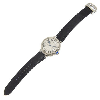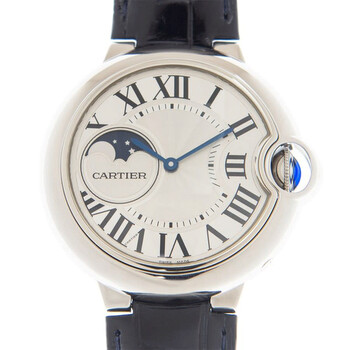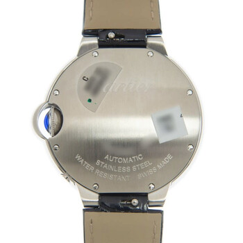 Stainless steel case with a blue alligator band. Stainless steel bezel. Silver-tone dial with blue hands. Dial Type: Analog. Automatic movement. Scratch resistant sapphire crystal. Screw down crown. Solid case back. Round case shape, case size: 37 mm, case thickness: 13 mm. Deployment clasp. Water resistant at 30 meters / 100 feet. Functions: moonphase. Additional Info: original box, international warranty card, manual (complete accessories). Ballon Bleu Series. Luxury watch style. Watch label: Swiss Made. Cartier Ballon Bleu Automatic Silver Dial Men's Watch WSBB0029.
