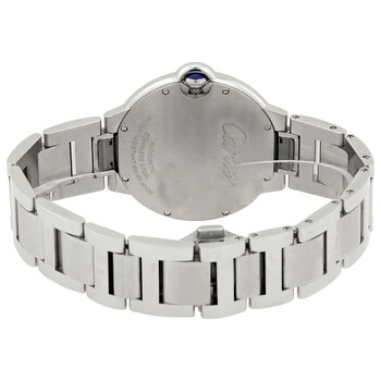 Stainless steel case with a stainless steel bracelet. Fixed stainless steel bezel. Silver dial with blued-steel sword-shaped hands and Roman numeral hour markers. Minute markers around an inner ring. Dial Type: Analog. Date display at the 3 o'clock position. Cartier calibre 1847 MC automatic movement, containing 23 Jewels, bitting at 28800 vph, and has a power reserve of approximately 42 hours. Scratch resistant sapphire crystal. Pull / push crown. Solid case back. Round case shape. Case size: 40 mm. Case thickness: 12.4 mm. Hidden fold over clasp. Water resistant at 30 meters / 100 feet. Functions: date, hour, minute, second. Ballon Bleu Series. Luxury watch style. Watch label: Swiss Made. Cartier Ballon Bleu Automatic Silver Dial Men's Watch wsbb0040.