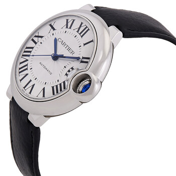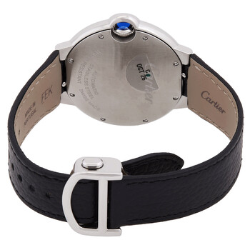 Silver-tone stainless steel case with a black leather strap. Fixed silver-tone stainless steel bezel. Silver dial with blue hands and Roman numeral hour markers. Minute markers around an inner ring. Dial Type: Analog. Automatic movement. Scratch resistant sapphire crystal. Solid case back. Round case shape, case size: 36 mm, case thickness: 12.06 mm. Deployment clasp. Water resistant at 30 meters / 100 feet. Functions: hour, minute, second. Ballon Bleu Series. Luxury watch style. Watch label: Swiss Made. Cartier Ballon Bleu Automatic Silver Dial Watch WSBB0056.