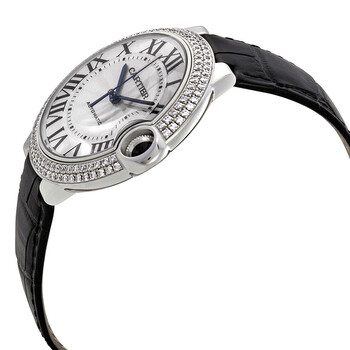 18kt yellow gold case with a black alligator leather strap. Fixed rhodium-finish 18k white- diamond set bezel. White with silvered guilloche dial with blued-steel sword-shaped hands and black Roman numeral hour markers. Minute scale around the inner rim. Dial Type: Analog. Date display at the 3 o'clock position. Automatic movement. Scratch resistant sapphire crystal. Fluted cabochon crown. Solid case back. Round case shape, case size: 42 mm, case thickness: 13 mm. Deployment clasp. Water resistant at 30 meters / 100 feet. Functions: date, hour, minute, second. Additional Info: case set with 126 brilliant-cut diamonds (1.83 carats). Luxury watch style. Watch label: Swiss Made. Cartier Ballon Bleu Automatic White Gold Diamond Watch WJBB0032.