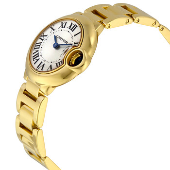 18kt yellow gold case and bracelet. Fixed 18kt yellow gold bezel. Silvered opaline dial with sword-shaped blue hands and Roman numeral hour markers. Minute markers around an inner ring. Luminescent hands and dial markers. Quartz movement. Scratch resistant sapphire crystal. Solid case back. Case diameter: 28.6 mm. Case thickness: 9.35 mm. Deployment clasp. Water resistant at 30 meters / 100 feet. Functions: hours, minutes. Cartier Ballon Bleu de Cartier 18k Yellow Gold Small Watch W69001Z2.