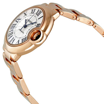 18kt pink gold case with a 18kt pink gold bracelet. Fixed smooth 18kt pink gold bezel. Lacquered silvered opaline flinque dial with blued-steel sword-shaped hands and black Roman numeral hour markers. Minute markers around an inner ring. Dial Type: Analog. Cartier Calibre 076 Automatic movement, based upon ETA 2670, containing 25 Jewels, bitting at 28800 vph, and has a power reserve of approximately 38 hours. Scratch resistant sapphire crystal. 18kt pink gold fluted with blue sapphire cabochon crown. Solid case back. Round case shape, case size: 33 mm, case thickness: 9.96 mm. Hidden fold over clasp. Water resistant at 30 meters / 100 feet. Functions: hour, minute, second. Luxury watch style. Watch label: Swiss Made. Cartier Ballon Bleu de Cartier 18kt Pink Gold 33mm Watch W6920068.