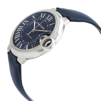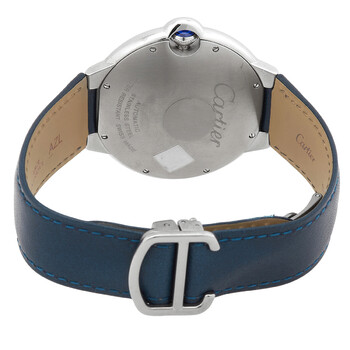 Silver-tone stainless steel case with a black leather strap. Fixed silver-tone stainless steel bezel. Blue dial with silver-tone hands and Roman numeral hour markers. Minute scale around the inner rim. Dial Type: Analog. Date display at the 3 o'clock position. Cartier Calibre 1847 MC Automatic movement, containing 23 Jewels, bitting at 28800 vph, and has a power reserve of approximately 42 hours. Scratch resistant sapphire crystal. Pull / push crown. Solid case back. Round case shape, case size: 42 mm, case thickness: 13 mm. Fold over clasp with a safety release. Water resistant at 30 meters / 100 feet. Functions: date, hour, minute, second. Ballon Bleu De Cartier Series. Luxury watch style. Watch label: Swiss Made. Cartier Ballon Bleu de Cartier Automatic Blue Dial Unisex Watch WSBB0042.