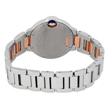 Stainless steel case with a stainless steel bracelet with 18kt rose gold center links. Fixed 18kt rose gold bezel. Silver dial with blue hands and Roman numeral hour markers. Minute markers around an inner ring. Dial Type: Analog. Automatic movement. Scratch resistant sapphire crystal. Pull / push crown. Solid case back. Case size: 33 mm. Case thickness: 10 mm. Round case shape. Fold over clasp with a safety release. Water resistant at 30 meters / 100 feet. Functions: hour, minute, second. Luxury watch style. Watch label: Swiss Made. Cartier Ballon Bleu De Cartier Automatic Silver Dial Ladies Watch W2BB0023.