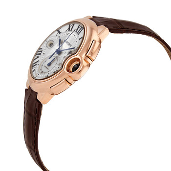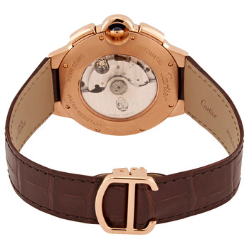 18kt rose gold case with a brown (alligator) leather strap. Fixed 18kt rose gold bezel. Silver guilloche dial with blue hands and Roman numeral hour markers. Minute markers around the inner ring. Dial Type: Analog. Date display at the 9 o'clock position. Chronograph - two sub-dials displaying: 60 second and 30 minute. Cartier calibre 8101 MC automatic movement, containing 33 Jewels, bitting at 28800 vph, and has a power reserve of approximately 42 hours. Scratch resistant sapphire crystal. 18kt rose gold fluted crown set with a blue cabochon sapphire. Transparent case back. Round case shape. Case size: 50 mm. Case thickness: 15 mm. 18kt rose gold double adjustable deployment clasp. Water resistant at 30 meters / 100 feet. Functions: chronograph, date, hour, minute, second. Ballon Bleu De Cartier Series. Luxury watch style. Watch label: Swiss Made. Cartier Ballon Bleu de Cartier Extra Large Watch W6920009.