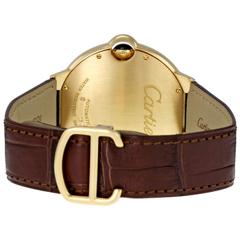 18kt yellow gold case with a brown leather strap. Fixed 18kt yellow gold bezel. Silver dial with blue hands and Roman numeral hour markers. Minute markers around an inner ring. Dial Type: Analog. Date display at the 3 o'clock position. Cartier calibre 049 automatic movement with a 42-hour power reserve. Scratch resistant sapphire crystal. Blue sapphire cabochon crown. Solid case back. Case size: 42 mm. Case thickness: 13 mm. Round case shape. Band width: 20 mm. Deployment clasp. Water resistant at 30 meters / 100 feet. Functions: hours, minutes, seconds, date. Additional Info: date displays at 3 o'clock position. Luxury watch style. Watch label: Swiss Made. Cartier Ballon Bleu de Cartier Men's Watch W6900551.