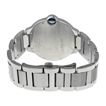 Stainless steel case with a stainless steel bracelet. Fixed stainless steel bezel. Silver opaline dial with sword-shaped blue hands and Roman numeral hour markers. Minute markers around an inner ring. Dial Type: Analog. Luminescent hands and dial markers. Date display at the 3 o'clock position. Automatic movement with a 42-hour power reserve. Scratch resistant sapphire crystal. Fluted push / pull crown set with synthetic cabochon-shaped spinel. Solid case back. Case diameter: 42 mm. Case thickness: 13 mm. Round case shape. Band width: 12 mm. Band length: 7 inches. Deployment clasp. Water resistant at 30 meters (100 feet). Functions: hours, minutes, seconds, date. Luxury watch style. Watch label: Swiss Made. Cartier Ballon Bleu de Cartier Silver Opaline Dial Stainless Steel Automatic Men's Watch W69012Z4.