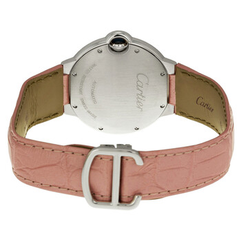18kt white gold case with a pink alligator leather strap. Fixed 18kt white gold diamond set bezel. Silvered opaline dial with blued-steel sword-shaped hands and black Roman numeral hour markers. Minute markers around the inner ring. Dial Type: Analog. Cartier Calibre 076 Automatic movement, based upon ETA 2670, containing 25 Jewels, bitting at 28800 vph, and has a power reserve of approximately 38 hours. Scratch resistant sapphire crystal. 18kt white gold fluted with blue sapphire cab crown. Solid case back. Round case shape, case size: 36.6 mm, case thickness: 12.1 mm. Deployment clasp. Water resistant at 30 meters / 100 feet. Functions: hour, minute, second. Ballon Bleu De Cartier Series. Luxury watch style. Watch label: Swiss Made. Item Variations: cabochon. Cartier Ballon Bleu de Cartier Silvered Opaline Dial 18kt White Gold Medium Watch WE900651.