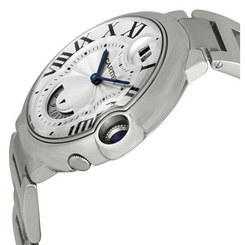Steel case with a steel bracelet. Fixed stainless steel bezel. Silvered opaline dial with blue steel hands and Roman numeral hour markers. Minute markers around an inner ring. Date displays at the 12 o'clock position. GMT sub-dial above the 6 o'clock position. Swiss quartz movement. Scratch resistant sapphire crystal. Blue spinel cabochon crown. Solid case back. Case diameter: 38.5 mm. Case thickness: 13 mm. Double deployment clasp. Water resistant at 30 meters (100 feet). Functions: hours, minutes, date, GMT. Cartier Ballon Bleu de Cartier Two Timezone Men's Watch W6920011.