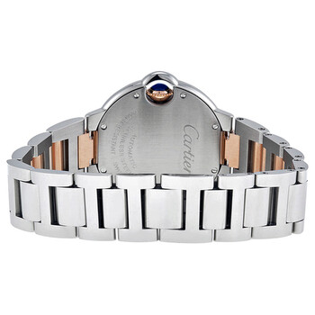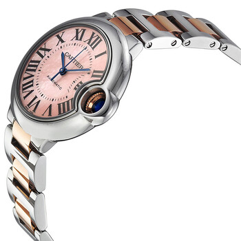 Stainless steel case with a stainless steel bracelet with 18kt rose gold center links. Fixed stainless steel bezel. Pink dial with blue steel hands and Roman numeral hour markers. Minute markers around an inner ring. Dial Type: Analog. Automatic movement. Cartier caliber 076 engine with about 38 hours power reserve. Scratch resistant mineral crystal. Push / pull crown set with a blue synthetic spinel cabochon. Solid case back. Case diameter: 33 mm. Case thickness: 9.3 mm. Round case shape. Deployment clasp. Water resistant at 30 meters / 100 feet. Functions: hour, minute, second. Dress watch style. Watch label: Swiss Made. Cartier Ballon Bleu de Cartier Watch W6920070.
