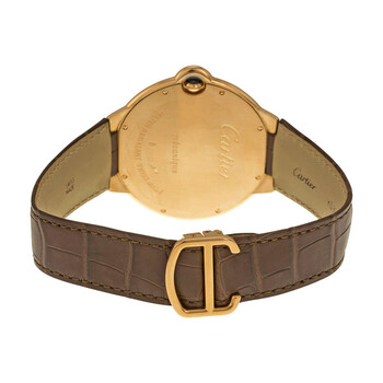 18kt rose gold case with a brown alligator leather strap. Fixed 18kt rose gold bezel. Silver dial with blued steel hands and Roman numeral hour markers. Minute markers around the inner ring. Dial Type: Analog. Mechanical movement. Scratch resistant sapphire crystal. 18kt rose gold fluted crown set with a blue sapphire cabochon. Solid case back. Case diameter: 46 mm. Case thickness: 7.05 mm. Double adjusting deployment clasp. Water resistant at 30 meters/ 100 feet. Functions: hours, minutes. Luxury watch style. Watch label: Swiss Made. Cartier Ballon Bleu Extra Large Silver Dial 18kt Rose Gold Leather Men's Watch W6920054.