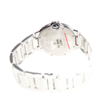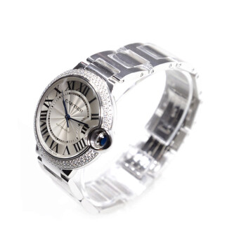 Polished 18kt white gold case with a white gold-tone polished 18kt white gold bracelet. Fixed 18kt white gold diamond set bezel. Silver opaline dial with blued-steel sword-shaped hands and Roman numeral hour markers. Minute markers around the inner ring. Dial Type: Analog. Luminescent hands and dial markers. Cartier Calibre 076 Automatic movement, based upon ETA 2670, containing 25 Jewels, bitting at 28800 vph, and has a power reserve of approximately 38 hours. Scratch resistant sapphire crystal. Fluted gold crown set with blue sapphire cabochon crown. Solid case back. Round case shape, case size: 37 mm, case thickness: 12 mm. 18kt white gold deployment buckle clasp. Water resistant at 30 meters / 100 feet. Functions: hour, minute, second. Ballon Bleu De Cartier Series. Luxury watch style. Watch label: Swiss Made. Cartier Ballon Bleu Medium 18k White Gold Watch WE9006Z3.