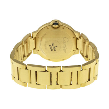 18kt yellow gold case with a yellow gold-tone 18kt yellow gold bracelet. Fixed 18kt yellow gold bezel. Silver opaline dial with blued-steel sword-shaped hands and black Roman numerals hour markers. Minute markers around an inner ring. Dial Type: Analog. Cartier calibre 076 automatic movement, based upon ETA 2670, containing 25 Jewels, bitting at 28800 vph, and has a power reserve of approximately 38 hours. Scratch resistant sapphire crystal. 18k gold fluted set with a synthetic blue cabochon crown. Solid case back. Round case shape. Case size: 36.2 mm. Case thickness: 11.9 mm. Deployment clasp. Water resistant at 30 meters / 100 feet. Functions: hour, minute, second. Ballon Bleu De Cartier Series. Luxury watch style. Watch label: Swiss Made. Cartier Ballon Bleu Medium Silver Opaline Dial 18kt Yellow Gold Watch W69003Z2.