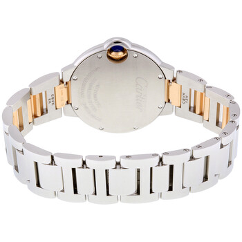 Stainless steel case with a stainless steel bracelet with 18kt rose gold center links. Fixed stainless steel bezel. Mother of pearl dial with blue hands and Roman numeral hour markers. Minute markers around an inner ring. Dial Type: Analog. Automatic movement. Scratch resistant sapphire crystal. Pull / push crown. Solid case back. Case diameter: 33 mm. Case thickness: 9.96 mm. Round case shape. Deployment clasp. Water resistant at 30 meters / 100 feet. Functions: hour, minute, second. Luxury watch style. Watch label: Swiss Made. Cartier Ballon Bleu Mother of Pearl Automatic Ladies Watch W6920098.