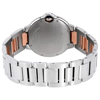 Stainless steel case with a stainless steel bracelet with 18kt rose gold links. Fixed stainless steel bezel. Pink mother of pearl dial with blued steel hands and Roman numeral hour markers. Minute markers around an inner ring. Dial Type: Analog. Cartier calibre 076 manual winding movement with a 38-hour power reserve. Scratch resistant sapphire crystal. Pull / push crown. Solid case back. Case size: 36 mm. Case thickness: 12.05 mm. Round case shape. Hidden fold over clasp. Water resistant at 30 meters / 100 feet. Functions: hour, minute, second. Luxury watch style. Watch label: Swiss Made. Cartier Ballon Bleu Pink Mother of Pearl Dial Ladies Watch W2BB0011.