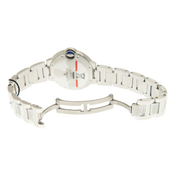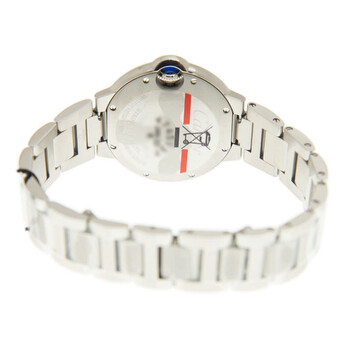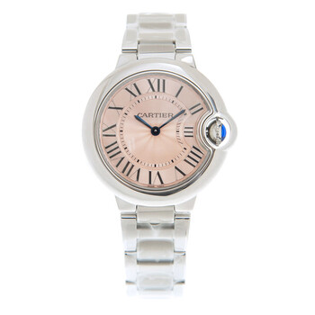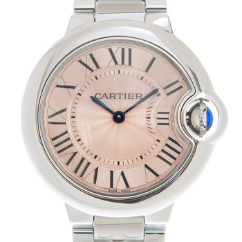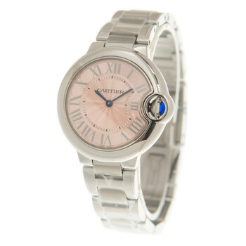 Stainless steel case with a silver-tone stainless steel bracelet. Fixed stainless steel bezel. Pink dial with Roman numeral hour markers. Dial Type: Analog. Quartz movement. Scratch resistant sapphire crystal. Screw down crown. Solid case back. Round case shape, case size: 33 mm, case thickness: 9.96. Deployment clasp. Water resistant at 30 meters / 100 feet. Functions: hour, minute. Ballon Bleu Series. Luxury watch style. Watch label: Swiss Made. Cartier Ballon Bleu Quartz Pink Dial Ladies Watch WSBB0033.