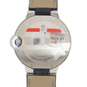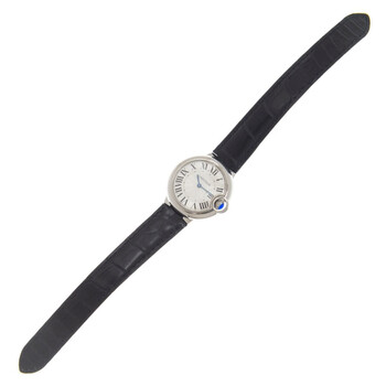 Stainless steel case with a black (alligator) leather strap. Fixed stainless steel bezel. Silver guilloche (lacquered) dial with blue hands and Roman numeral hour markers. Minute markers around an inner ring. Dial Type: Analog. Quartz movement. Scratch resistant sapphire crystal. Pull / push crown. Solid case back. Round case shape. Case size: 33 mm. Case thickness: 10 mm. Deployment clasp. Water resistant at 30 meters / 100 feet. Functions: hour, minute. Additional Info: crown set with a synthetic cabochon-shaped spinel. Ballon Bleu Series. Luxury watch style. Watch label: Swiss Made. Cartier Ballon Bleu Quartz Silver Guilloche Dial Ladies Watch WSBB0034.