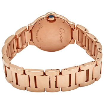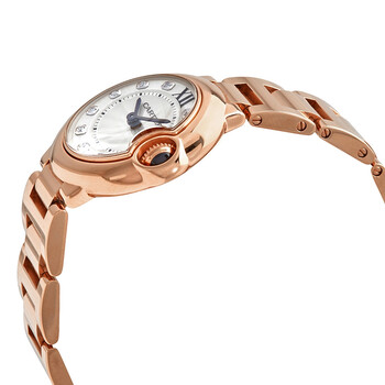 18kt rose gold case with a 18kt rose gold bracelet. Fixed 18kt rose gold bezel. Silver sunray dial dial with blued-steel sword-shaped hands and diamond hour markers. Minute markers around an inner ring. Dial Type: Analog. Cartier Calibre 057 quartz movement. Scratch resistant sapphire crystal. Round case shape, case size: 28.6 mm, case thickness: 9.35 mm. Deployment clasp. Water resistant at 30 meters / 100 feet. Functions: hour, minute. Additional Info: 11 diamonds set on dial. Dress watch style. Watch label: Swiss Made. Cartier Ballon Bleu Silver Dial 18k Rose Gold Ladies Watch WE902025.
