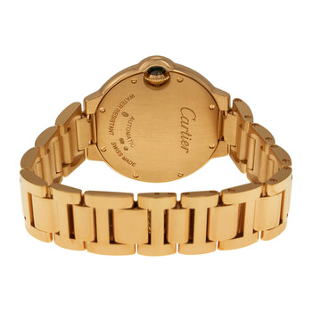 18kt rose gold case with a 18kt rose gold bracelet. Fixed 18kt rose gold bezel. Silver dial with blue hands and diamond hour markers. Roman numeral marks the 12 o'clock position. Minute markers around an inner ring. Dial Type: Analog. Automatic movement. Scratch resistant sapphire crystal. Push / pull crown set with a blue cabochon sapphire. Solid case back. Case diameter: 33 mm. Case thickness: 9.96 mm. Round case shape. Band width: 17.8 mm. Band length: 7. Hidden deployment clasp. Water resistant at 30 meters / 100 feet. Functions: hour, minute. Luxury watch style. Watch label: Swiss Made. Cartier Ballon Bleu Silver Dial 18kt Rose Gold Automatic Ladies Watch WE902039.
