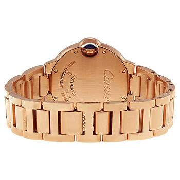 18kt rose gold case with a rose gold-tone 18kt rose gold bracelet. Fixed 18kt rose gold 18kt rose gold set with two rows of diamonds bezel. Silver dial with blued-steel sword-shaped hands and Roman numeral hour markers. Minute markers around an inner ring. Dial Type: Analog. Cartier Calibre 076 Automatic movement, based upon ETA 2670, containing 25 Jewels, bitting at 28800 vph, and has a power reserve of approximately 38 hours. Scratch resistant sapphire crystal. Blue sapphire cabochon crown. Screw down case back. Round case shape, case size: 33 mm, case thickness: 9.96 mm. Hidden fold over clasp. Water resistant at 30 meters / 100 feet. Functions: hour, minute, second. Ballon Bleu De Cartier Series. Dress watch style. Watch label: Swiss Made. Cartier Ballon Bleu Silver Dial 18kt Rose Gold Diamond Ladies Watch WE902034.
